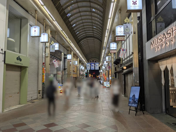旁邊就是商店街,我們兩個都不是會逛街的類型,所以就很快的通過。我有進去一間藥妝店找我媽託我買的東西,找了一下沒找到後直接拿圖片問店員「すみません、これはありますか」,他想了一下回答我沒有,我回應「そうですか」。